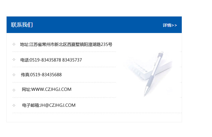 地址:常州市新北區友邦商務大廈1幢16、17層  電話:0519-85101652  傳真:0519-85112595  郵編:213022  網址:www.cz-jiayue_cn.zjshuixiang168.com  郵箱:xiajifengaa@163.com